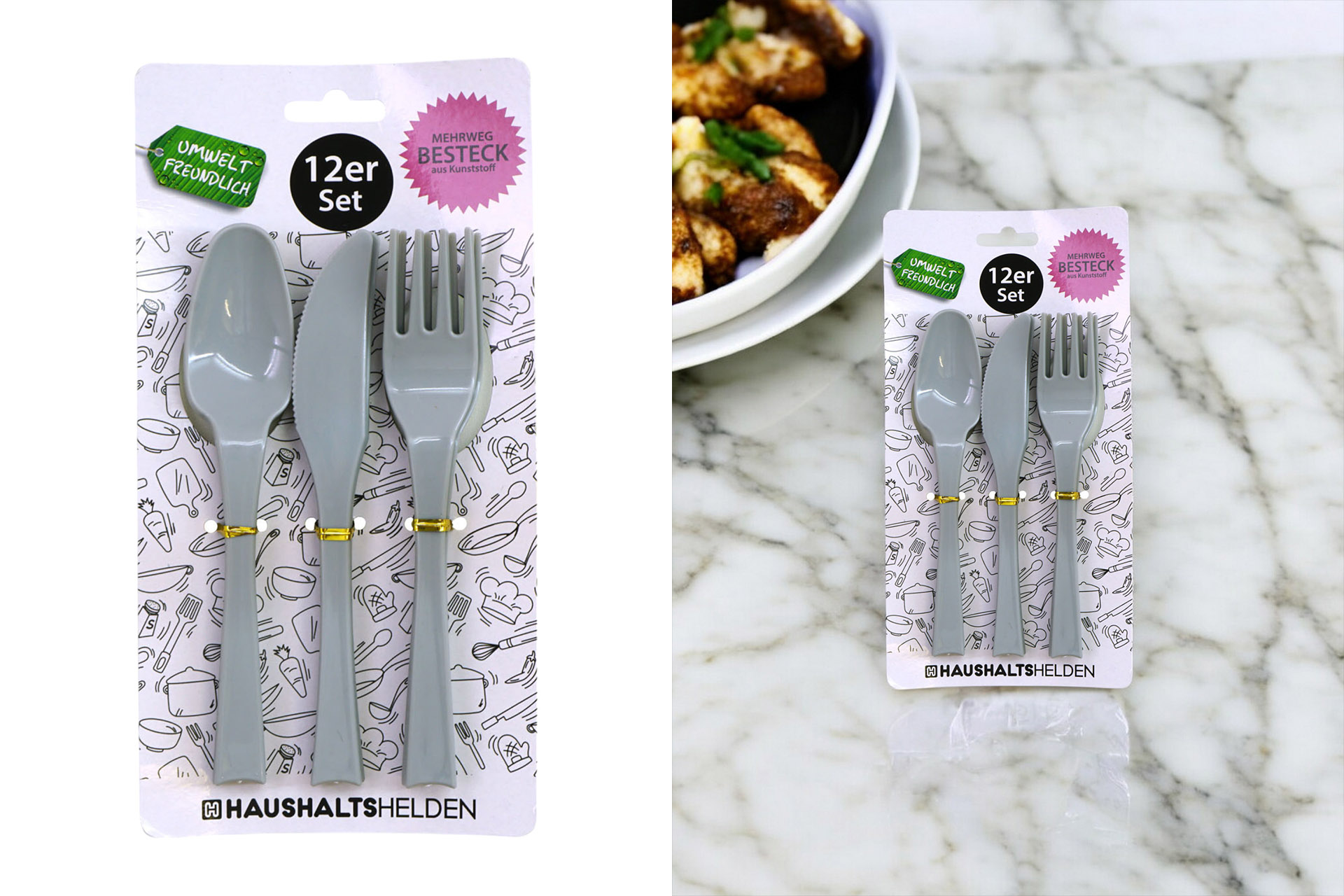 Besteck Kunststoff Mehrweg, 12er Set, 19x3,5cm, grau 4x Messer, 4x Löffel, 4x Gabel auf Karte