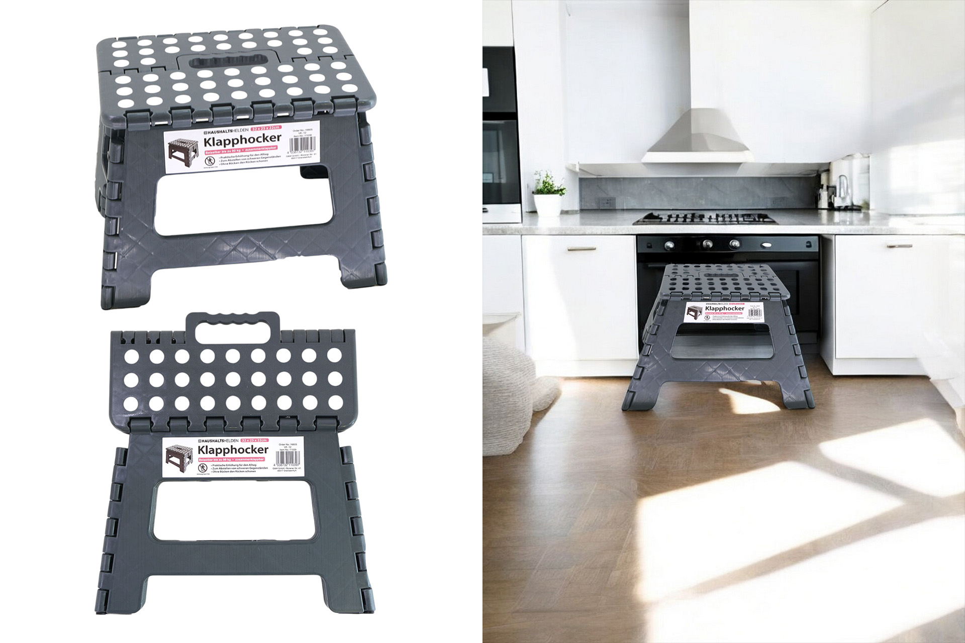 Klapphocker anthrazit faltbar, 30,5x22x22cm, belastbar bis150kg Gewicht: 992g Barcodesticker