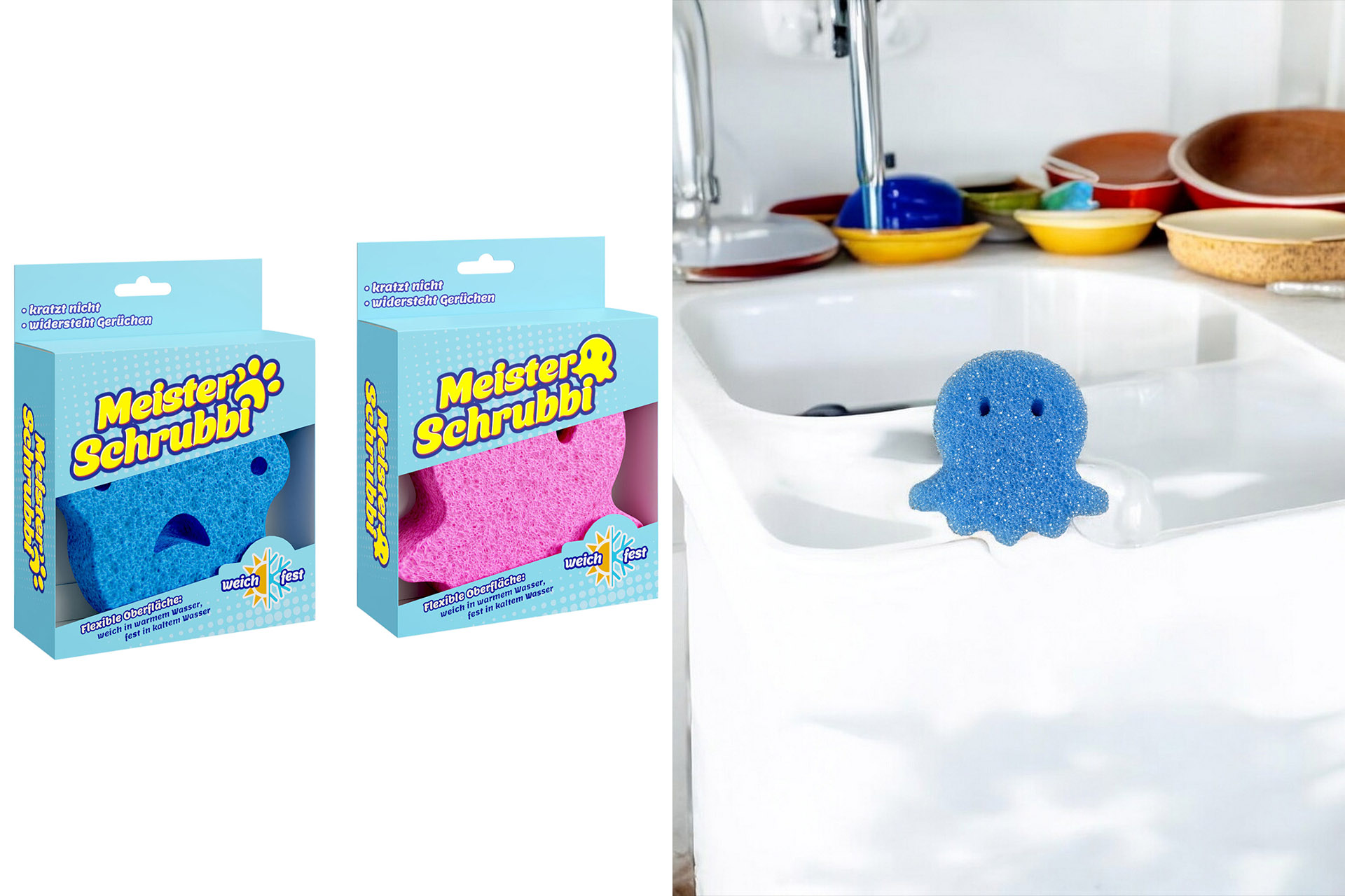 Putzschwamm/Küchenschwamm "Meister Schrubbi", 10x10x5cm, 2 Farben, 2 Designs