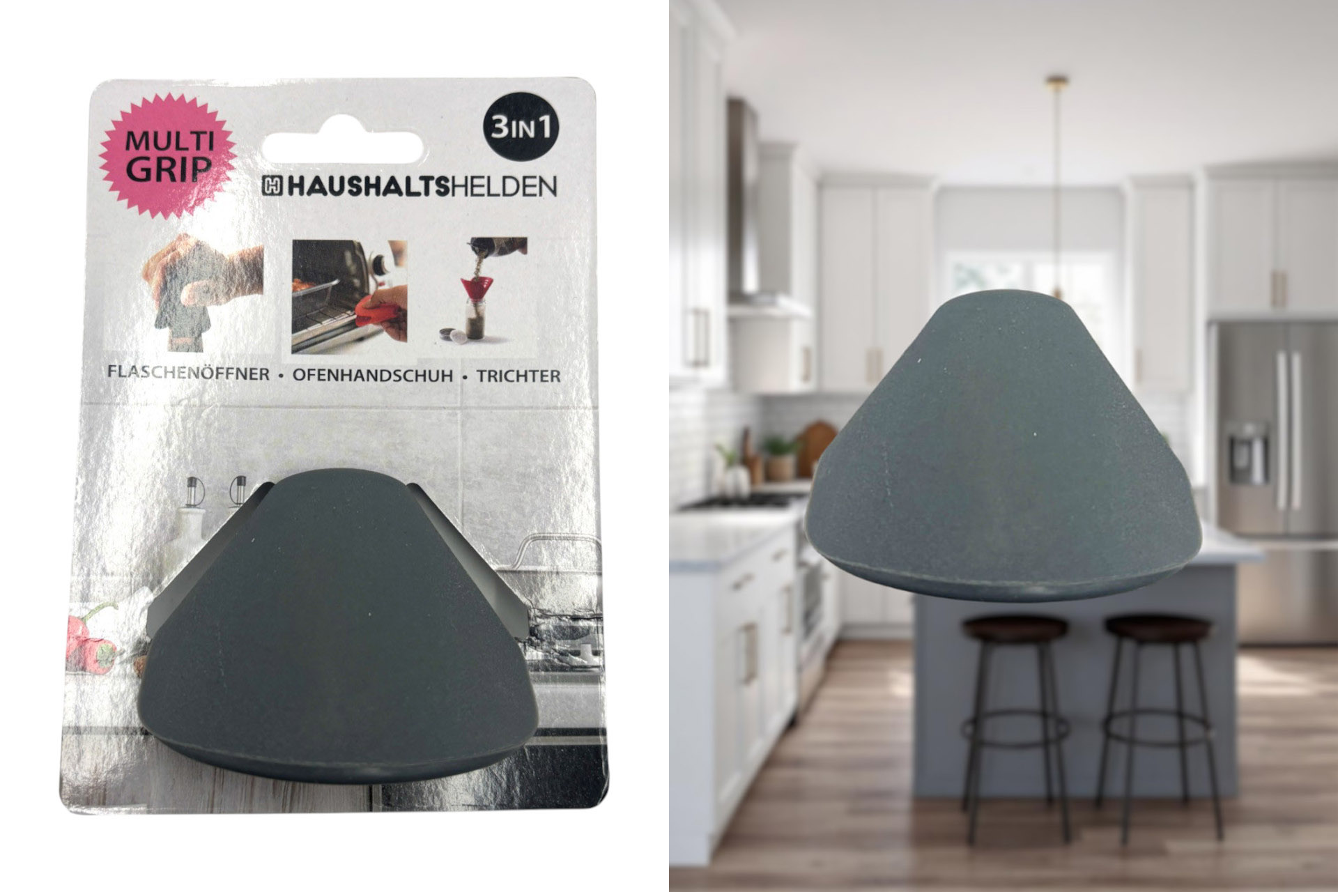 Silikon-Grip Multifunktionell 3in1 Flaschenöffner, Trichter, Ofenhandschuh, grau