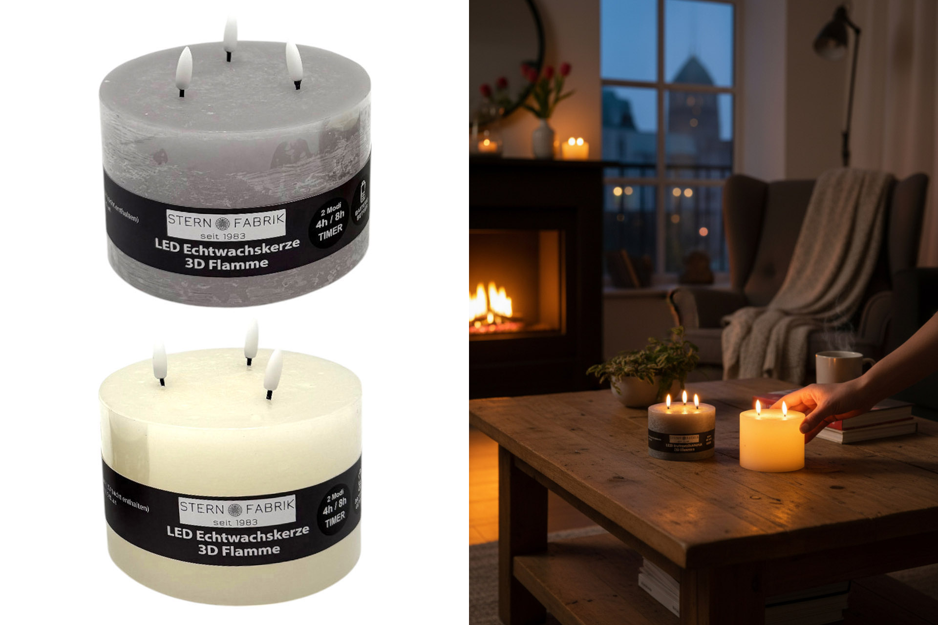 XXL LED Echtwachskerze "3D Flamme" 15x15x10cm, mit Timer, 2 Farben, im Display