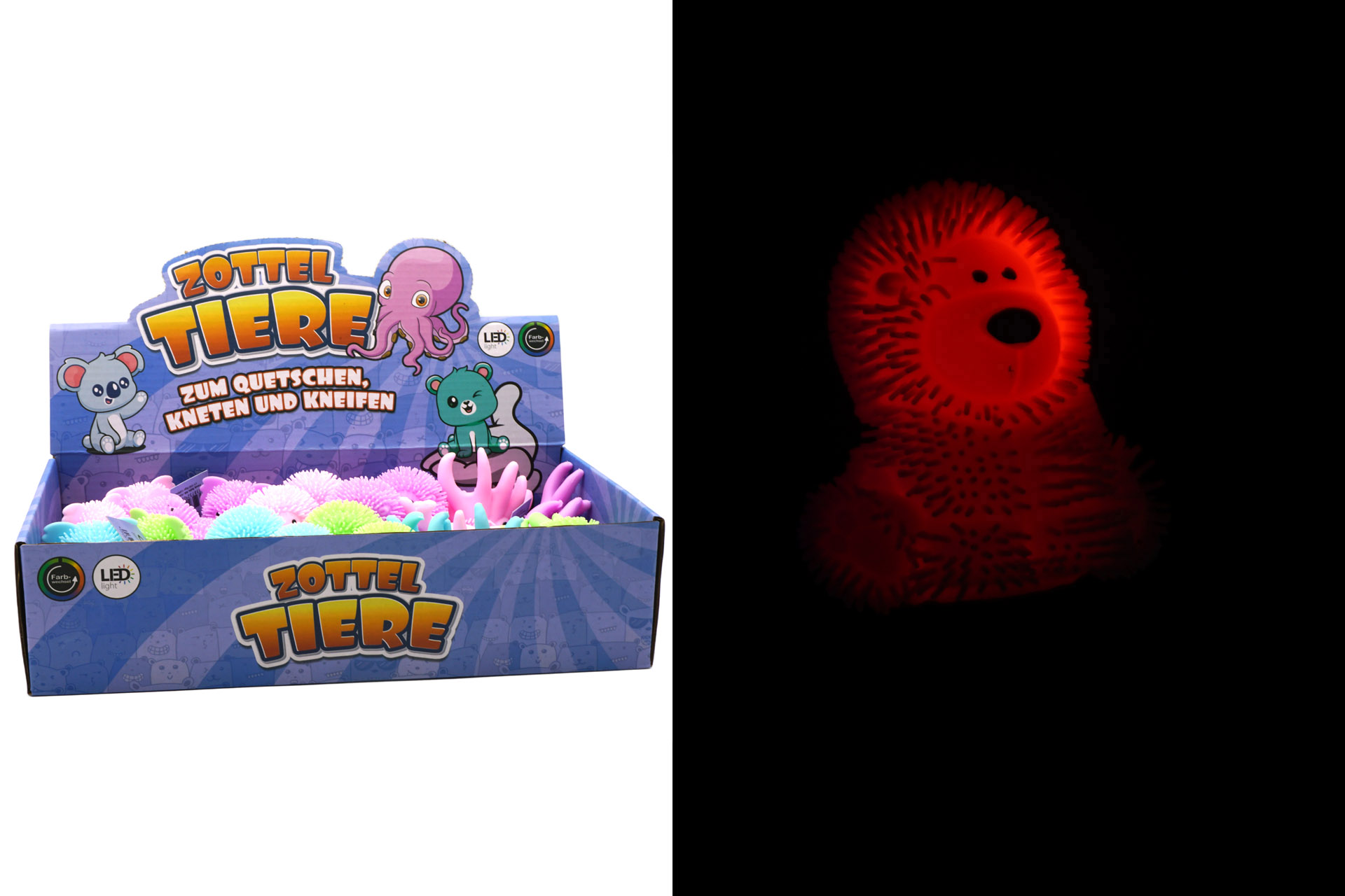 Produktinformationen "Zottel Tier 8cm, 4 Farben, 3 fach sortiert im Display, LED"