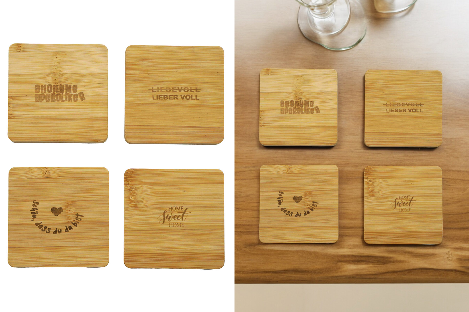 Bambus Untersetzer mit Druck, 8,9x8,9x0,8cm, 4 Designs